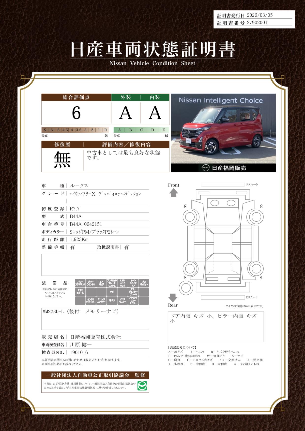「車両状態証明書」は、査定協会監修のプロの検査員が公正かつ確かな基準で検査した”安心の証”です。