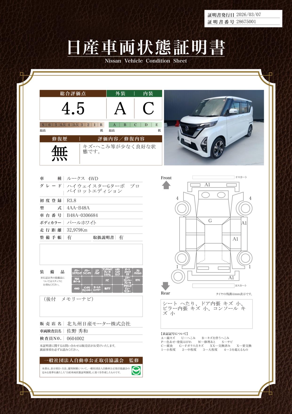 「車両状態証明書」は、査定協会監修のプロの検査員が公正かつ確かな基準で検査した”安心の証”です。