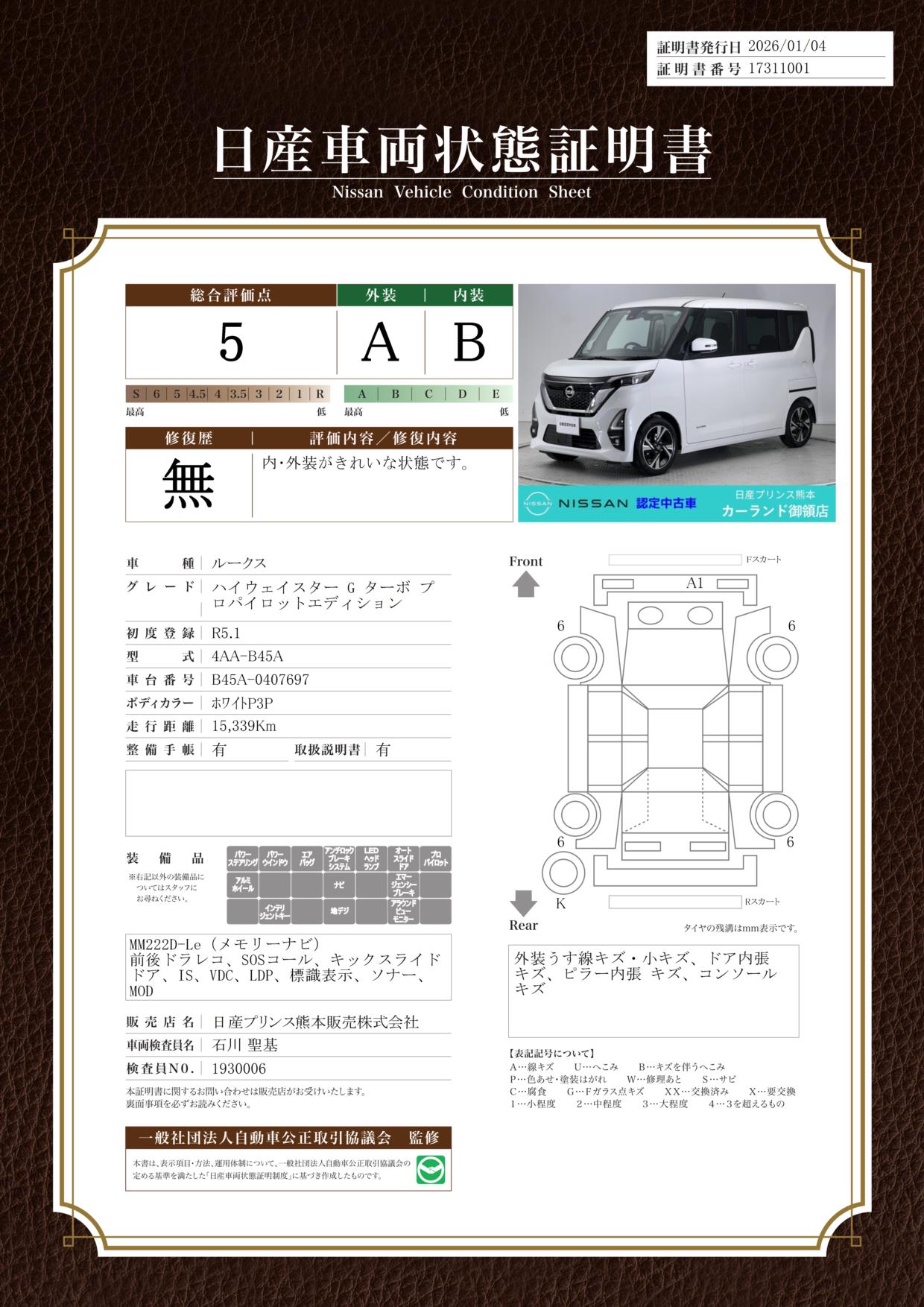 現状括弧書き内の年月まで車検有効期限が残っていますが、ご成約時に新しく車検を取り直します。なお取り直しの費用は車両価格に含まれています。