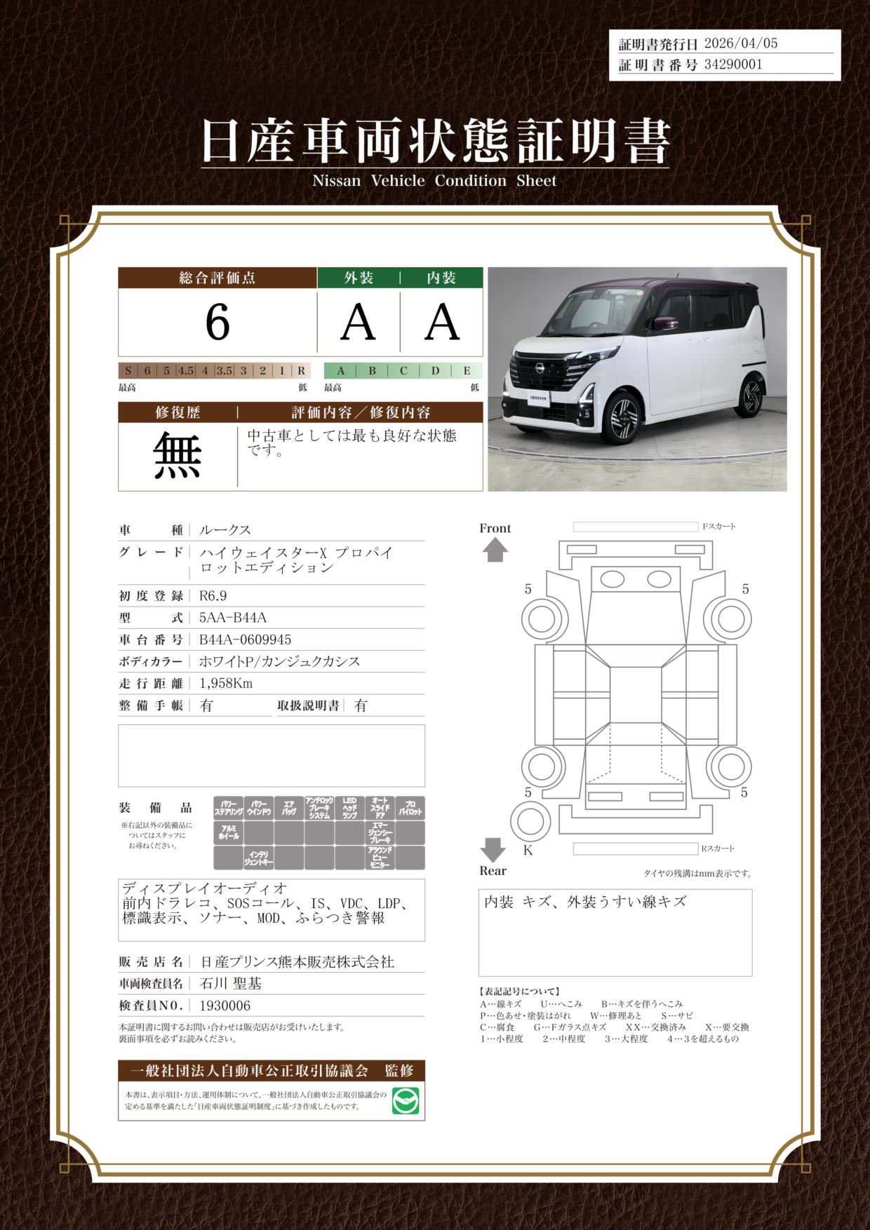 「車両状態証明書」は、査定協会監修のプロの検査員が公正かつ確かな基準で検査した”安心の証”です。