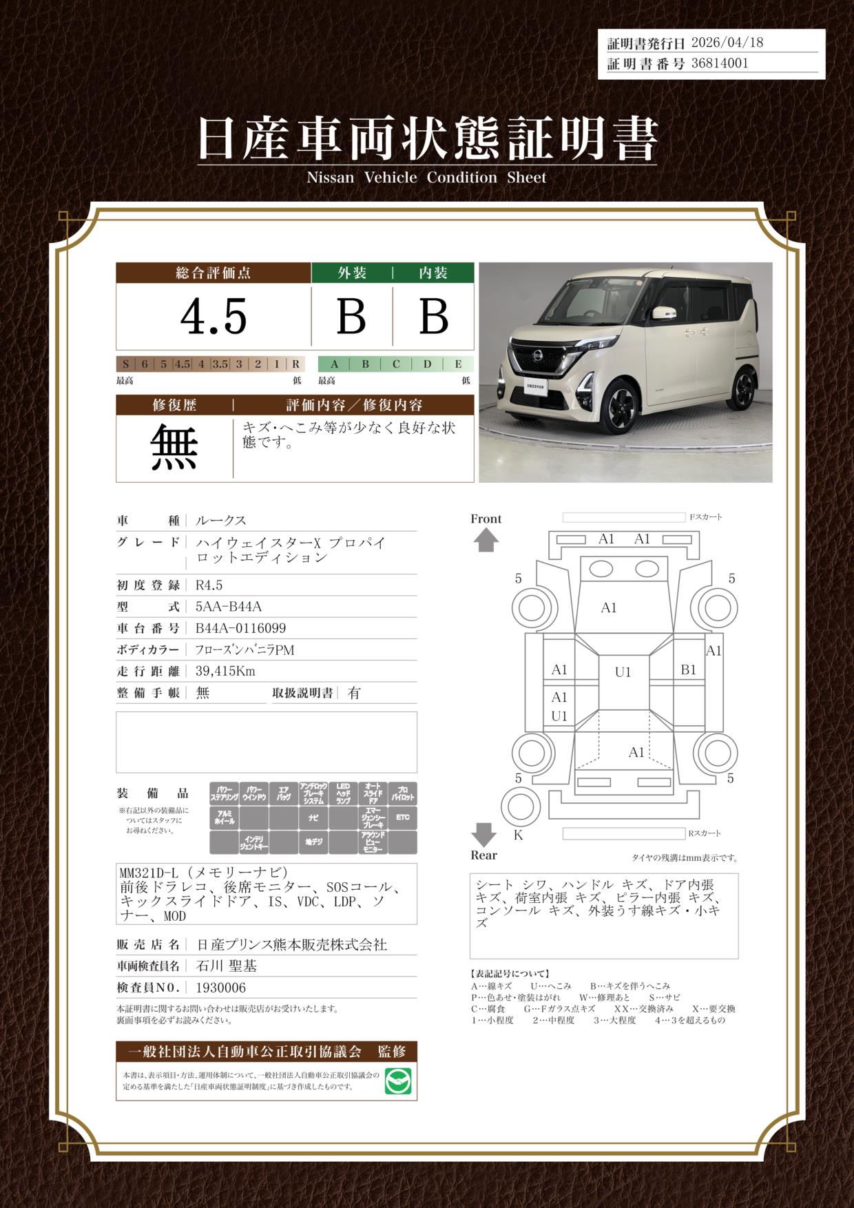 「車両状態証明書」は、査定協会監修のプロの検査員が公正かつ確かな基準で検査した”安心の証”です。