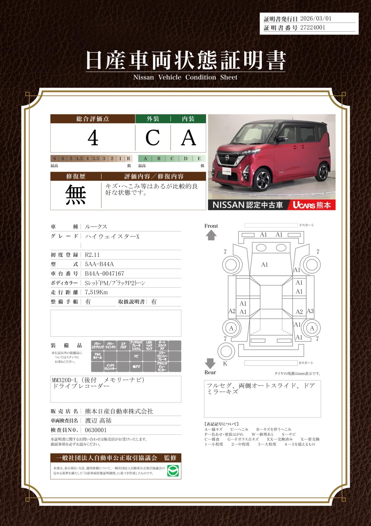 現状括弧書き内の年月まで車検有効期限が残っていますが、ご成約時に新しく車検を取り直します。なお取り直しの費用は車両価格に含まれています。