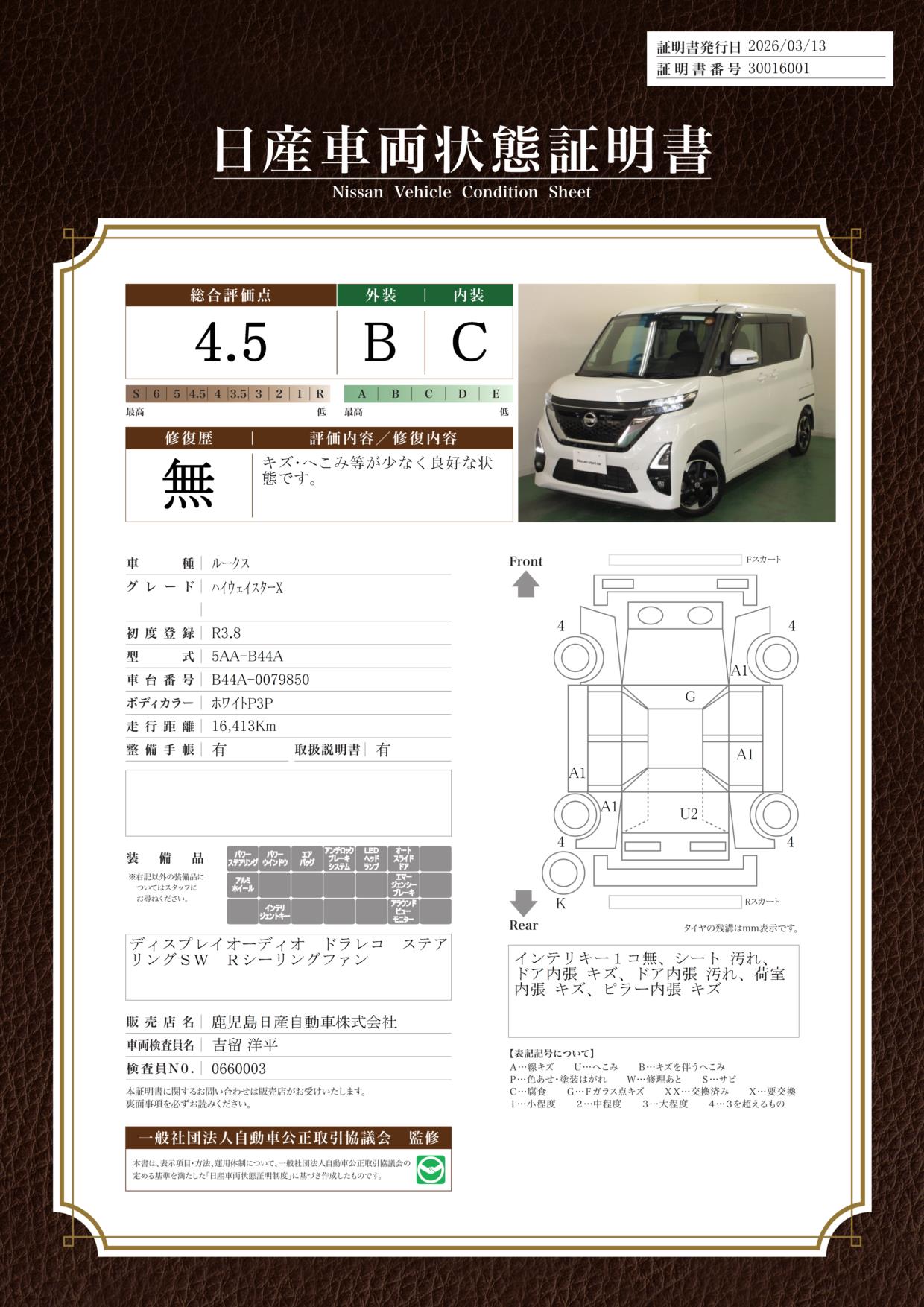 「車両状態証明書」は、査定協会監修のプロの検査員が公正かつ確かな基準で検査した”安心の証”です。