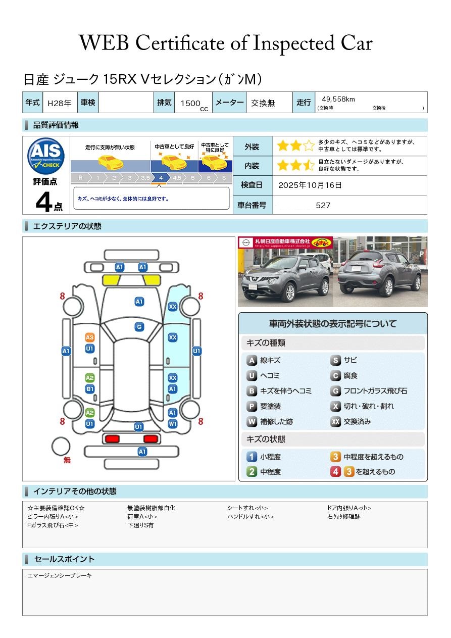 ジューク 1500cc 1.5 15RX Vセレクション FF車・メモリーナビゲーション・横滑り防止