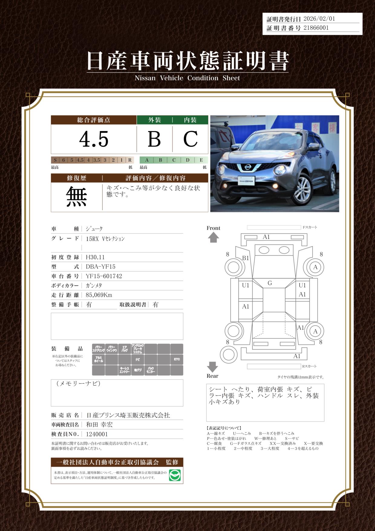 現状車検切れの状態ですが、ご成約時に新しく車検を実施します。車検費用は車両価格に含まれています。