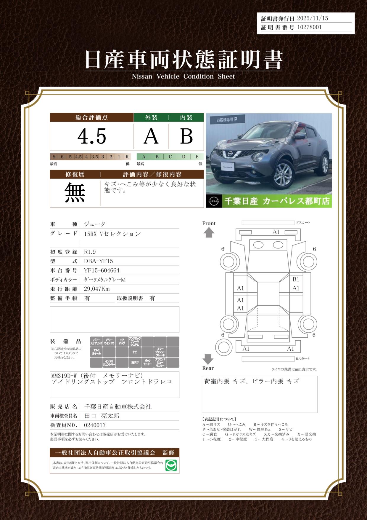 ジューク 1500cc 1.5 15RX Vセレクション 純正ナビ ドラレコ付