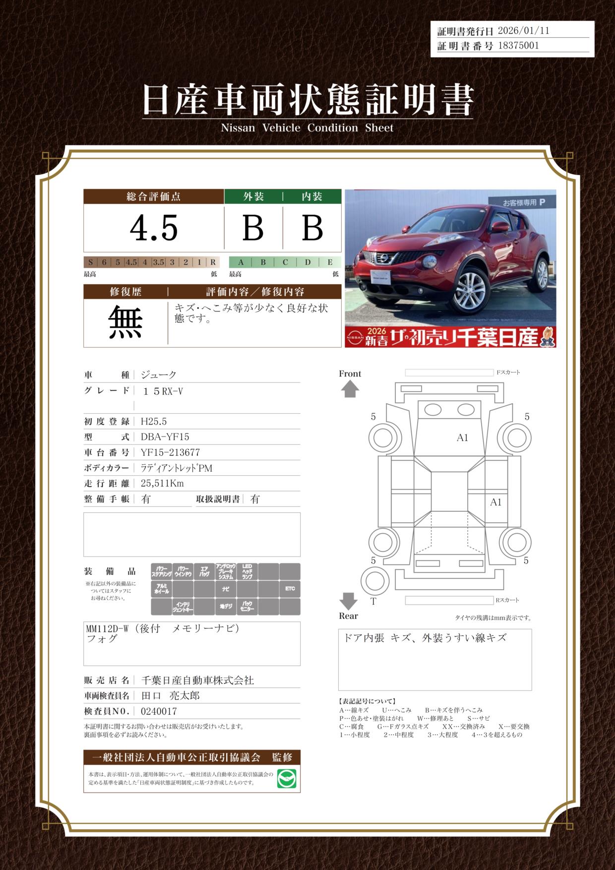 評価機関 : 日産車両状態証明