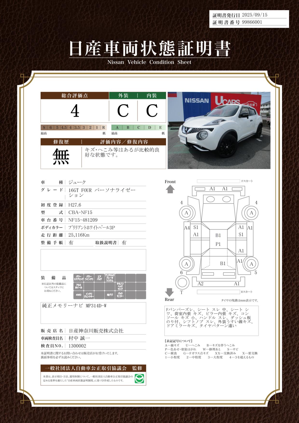 現状括弧書き内の年月まで車検有効期限が残っていますが、ご成約時に新しく車検を取り直します。なお取り直しの費用は車両価格に含まれています。