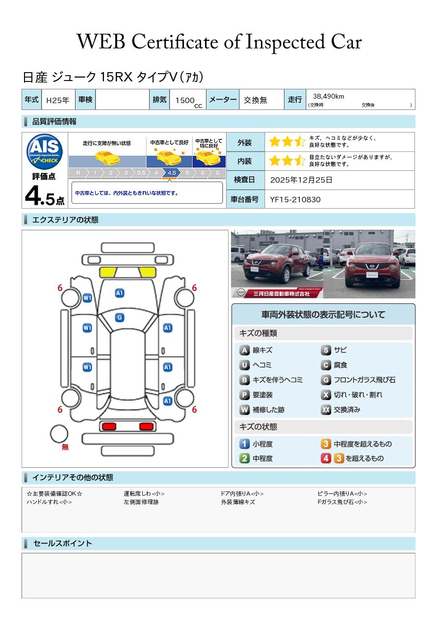 評価点イメージ : 中古車としては、内外装ともきれいな状態です。