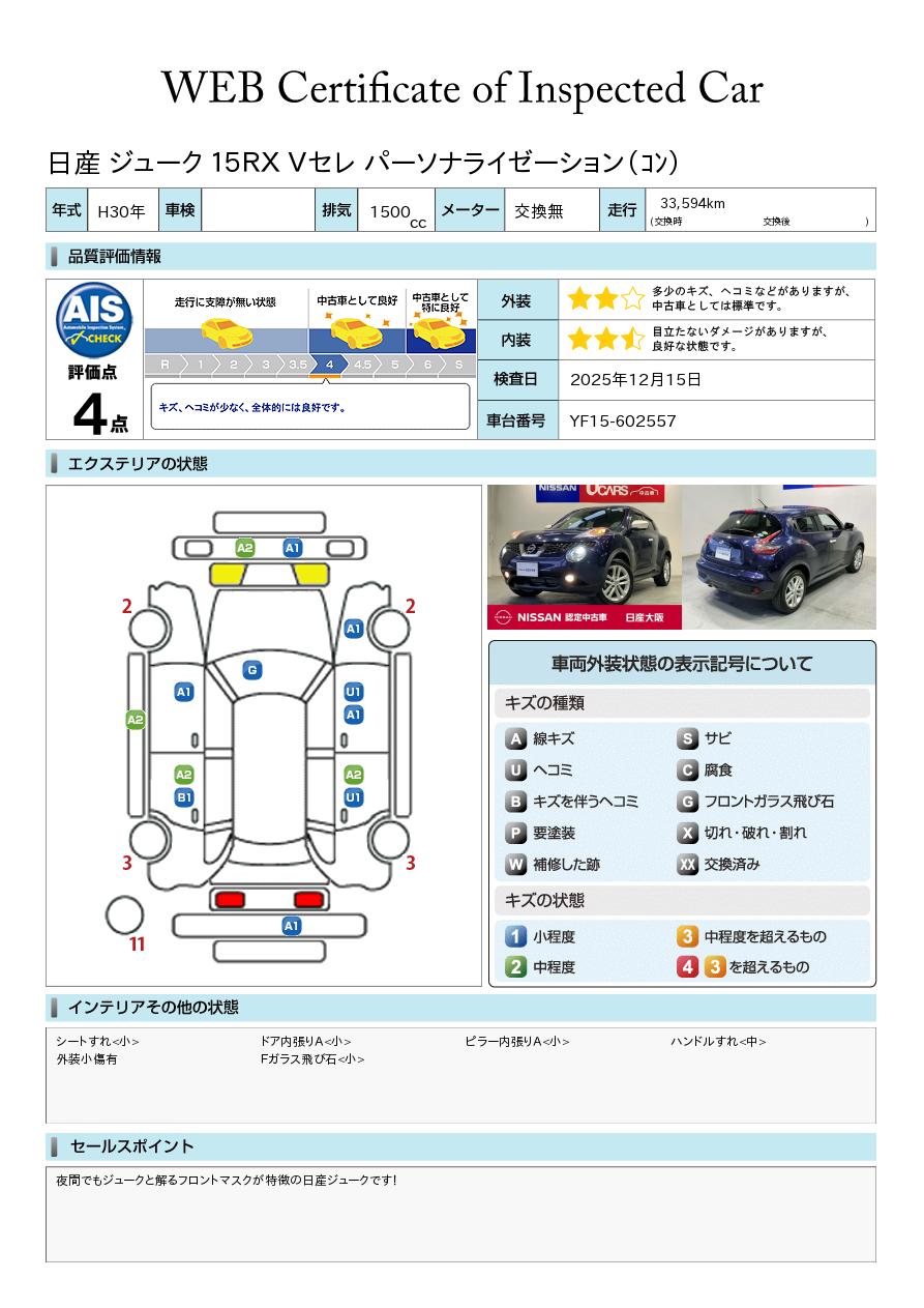 夜間でもジュークと解るフロントマスクが特徴の日産ジュークです!当店のお車はトラブル防止の為、一度のご来店をお願いしております。