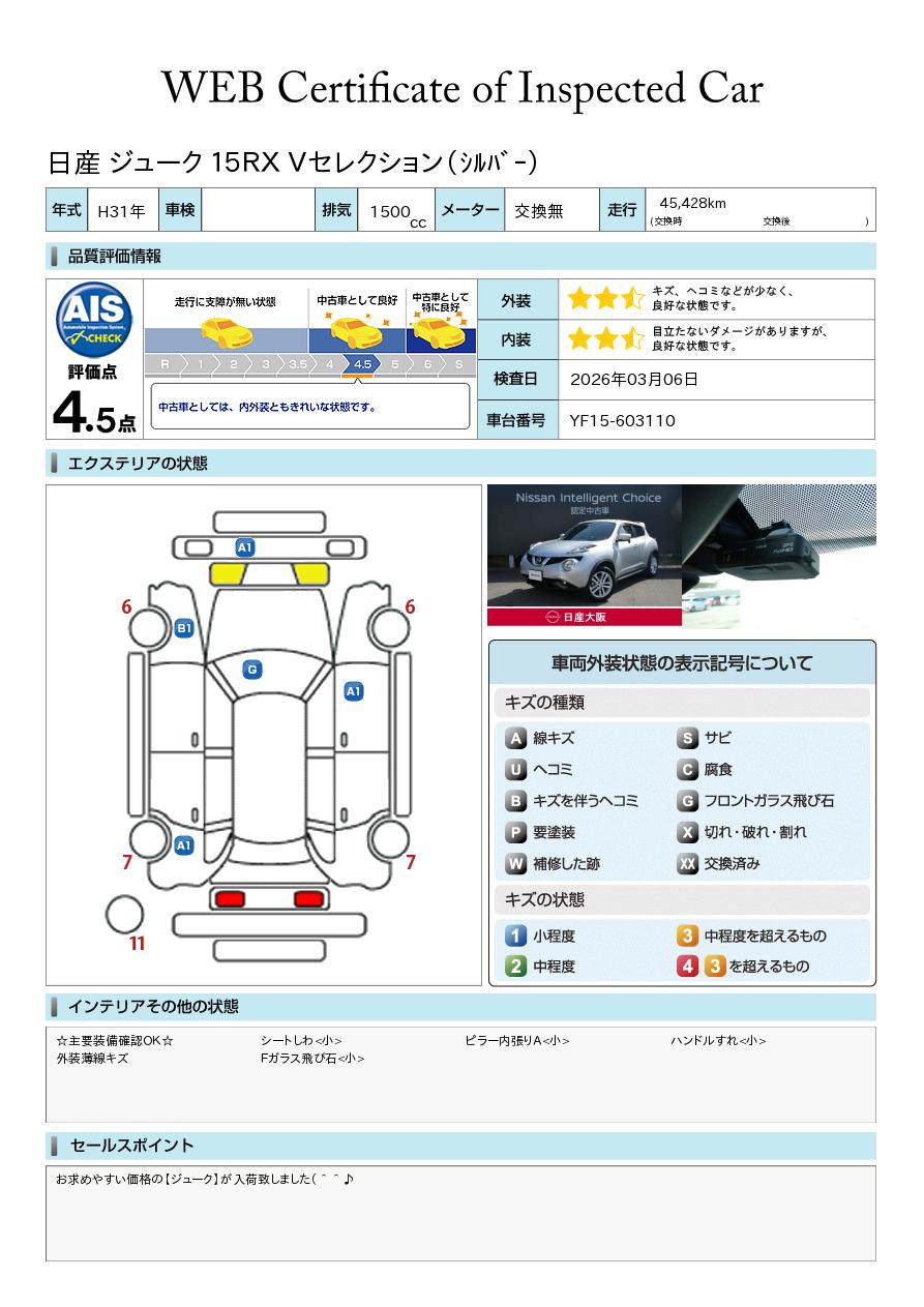 お求めやすい価格の【ジューク】が入荷致しました(^^♪お支払い総額は大阪府内での基本お見積もりです。他府県登録も可能ですのでお気軽にお問い合わせください。