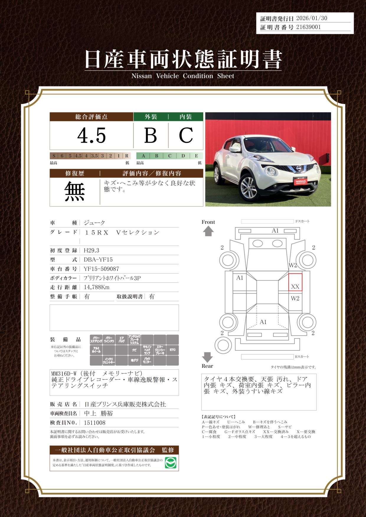 ジューク 1500cc 1.5 15RX Vセレクション 純正メモリーナビ・バックモニター・エマー