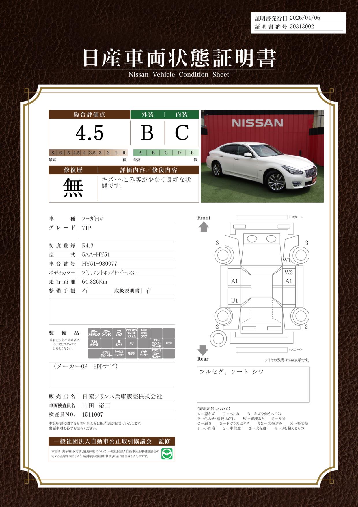 現状括弧書き内の年月まで車検有効期限が残っていますが、ご成約時に新しく車検を取り直します。なお取り直しの費用は車両価格に含まれています。