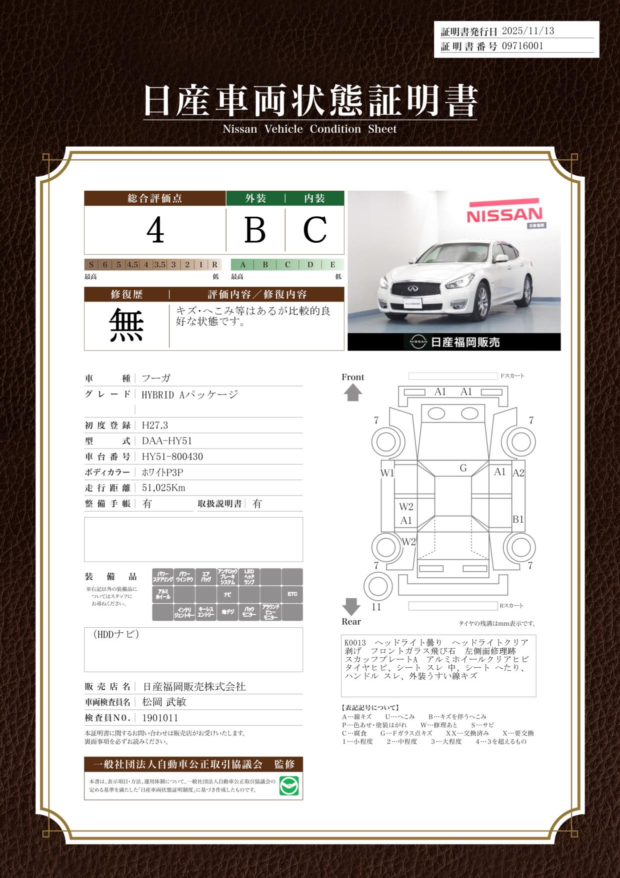 評価機関 : 日産車両状態証明