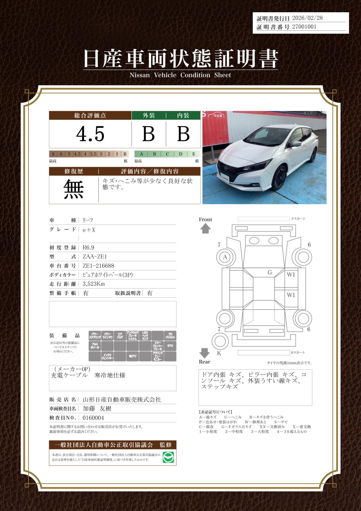 「車両状態証明書」は、査定協会監修のプロの検査員が公正かつ確かな基準で検査した”安心の証”です。