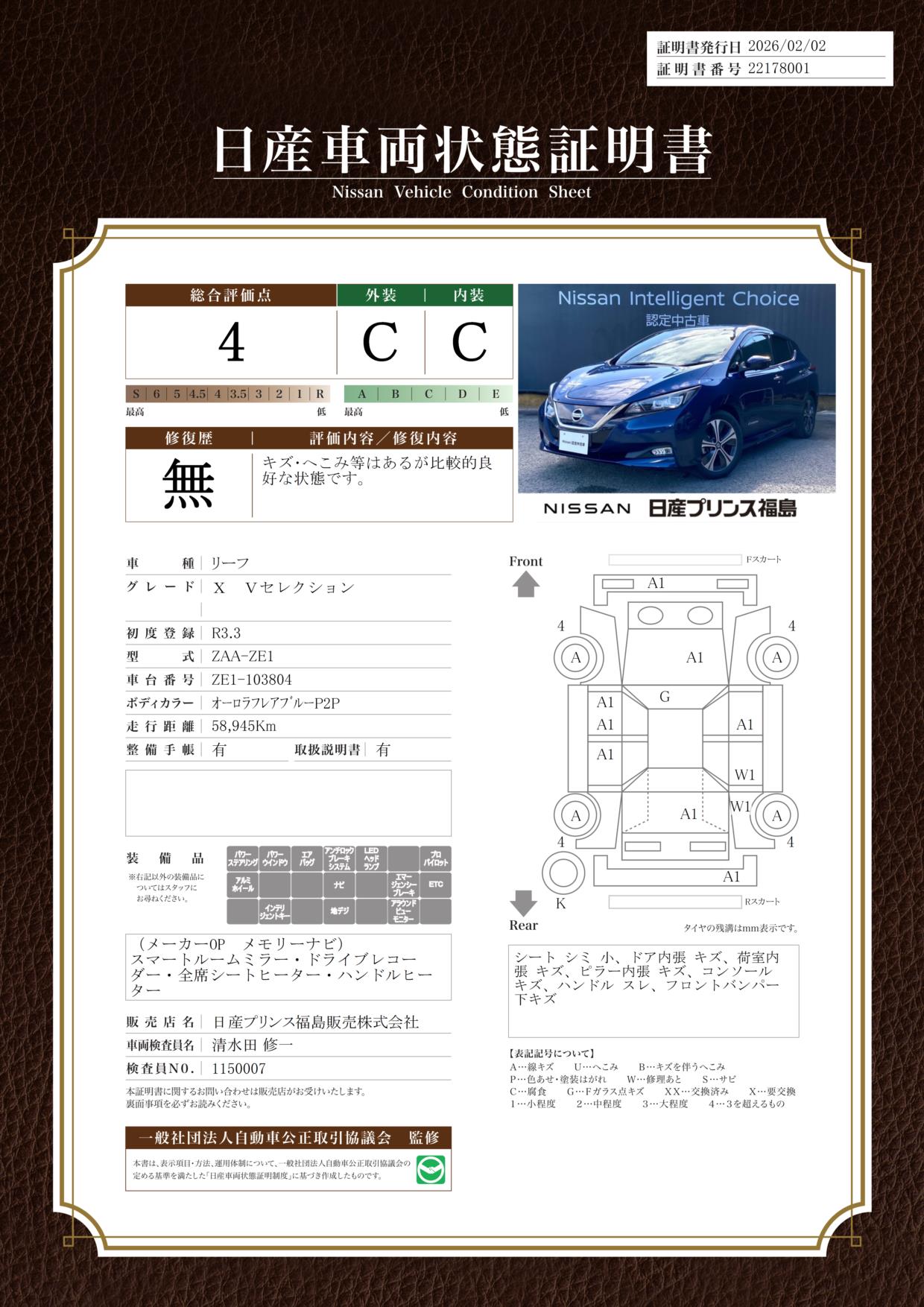 評価機関 : 日産車両状態証明