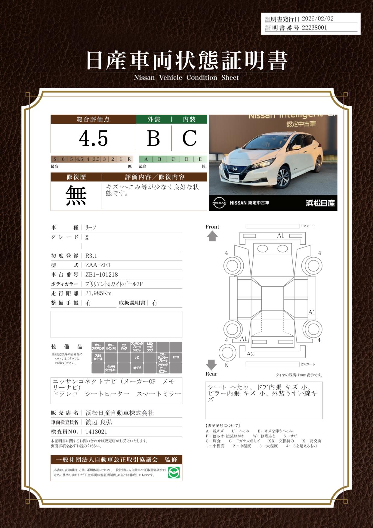 評価機関 : 日産車両状態証明