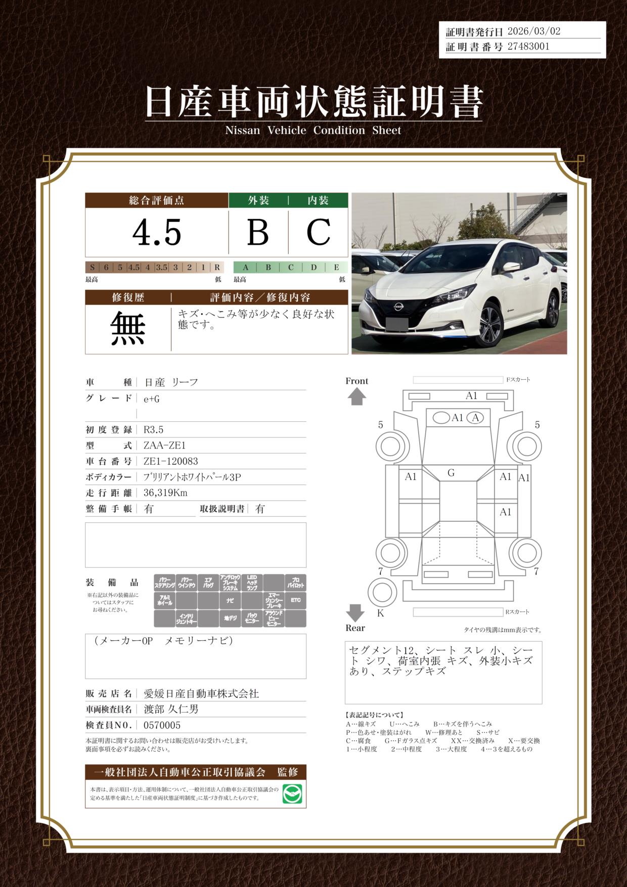 「車両状態証明書」は、査定協会監修のプロの検査員が公正かつ確かな基準で検査した”安心の証”です。