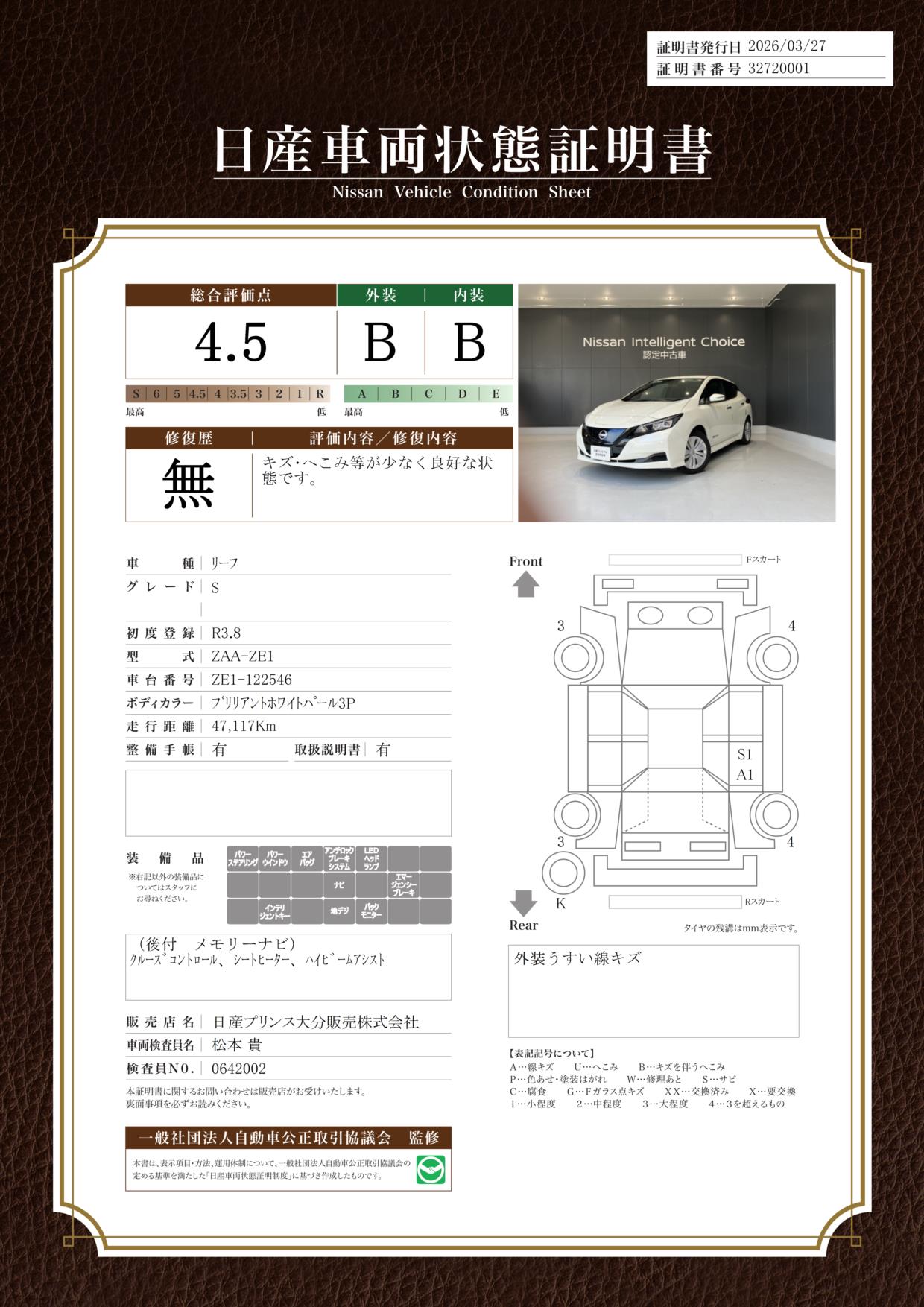 「車両状態証明書」は、査定協会監修のプロの検査員が公正かつ確かな基準で検査した”安心の証”です。