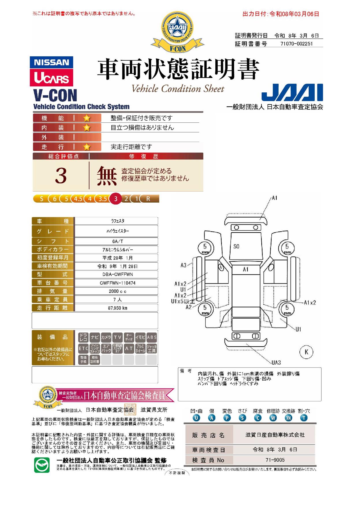 現状括弧書き内の年月まで車検有効期限が残っていますが、ご成約時に新しく車検を取り直します。なお取り直しの費用は車両価格に含まれています。