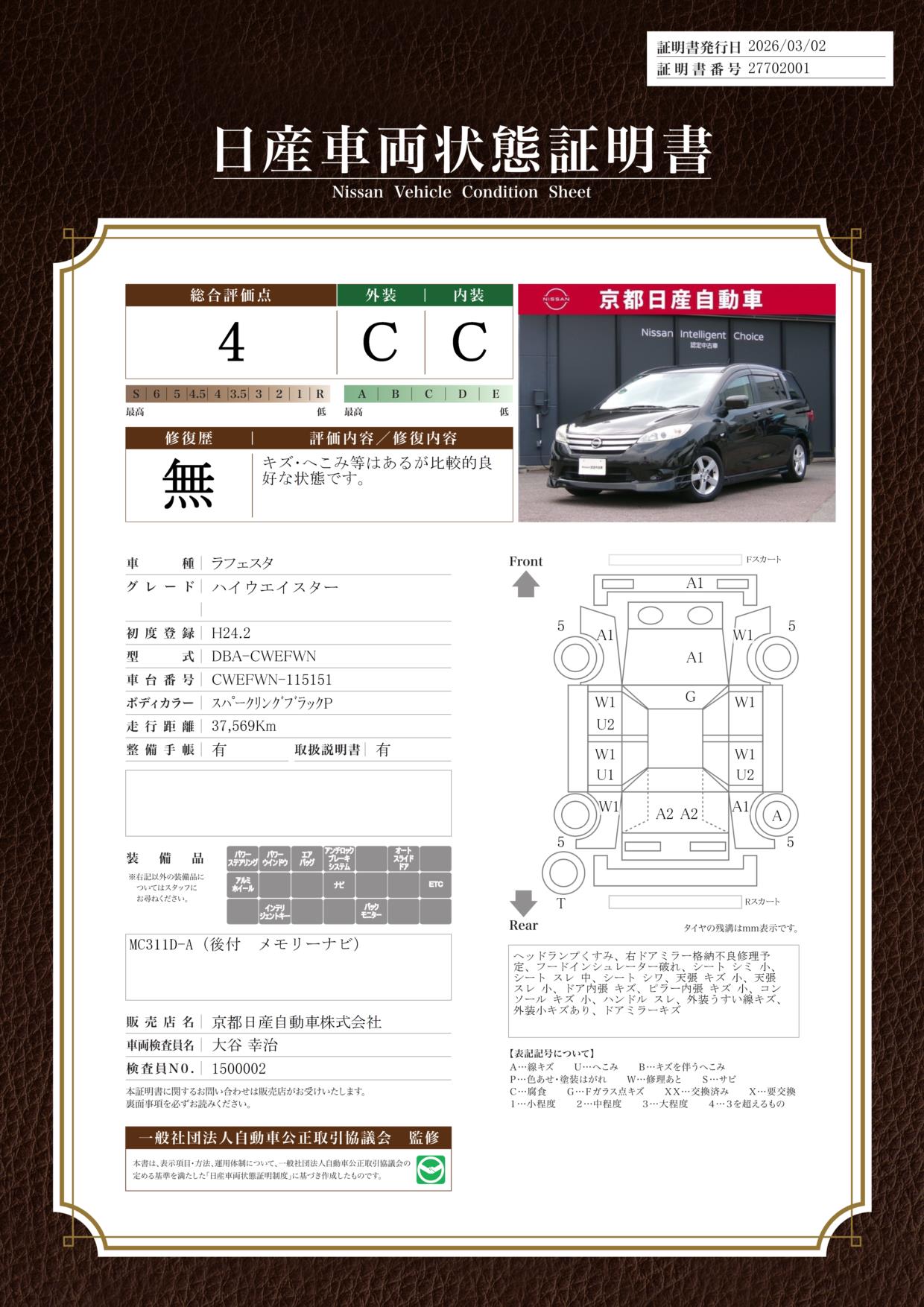 評価機関 : 日産車両状態証明