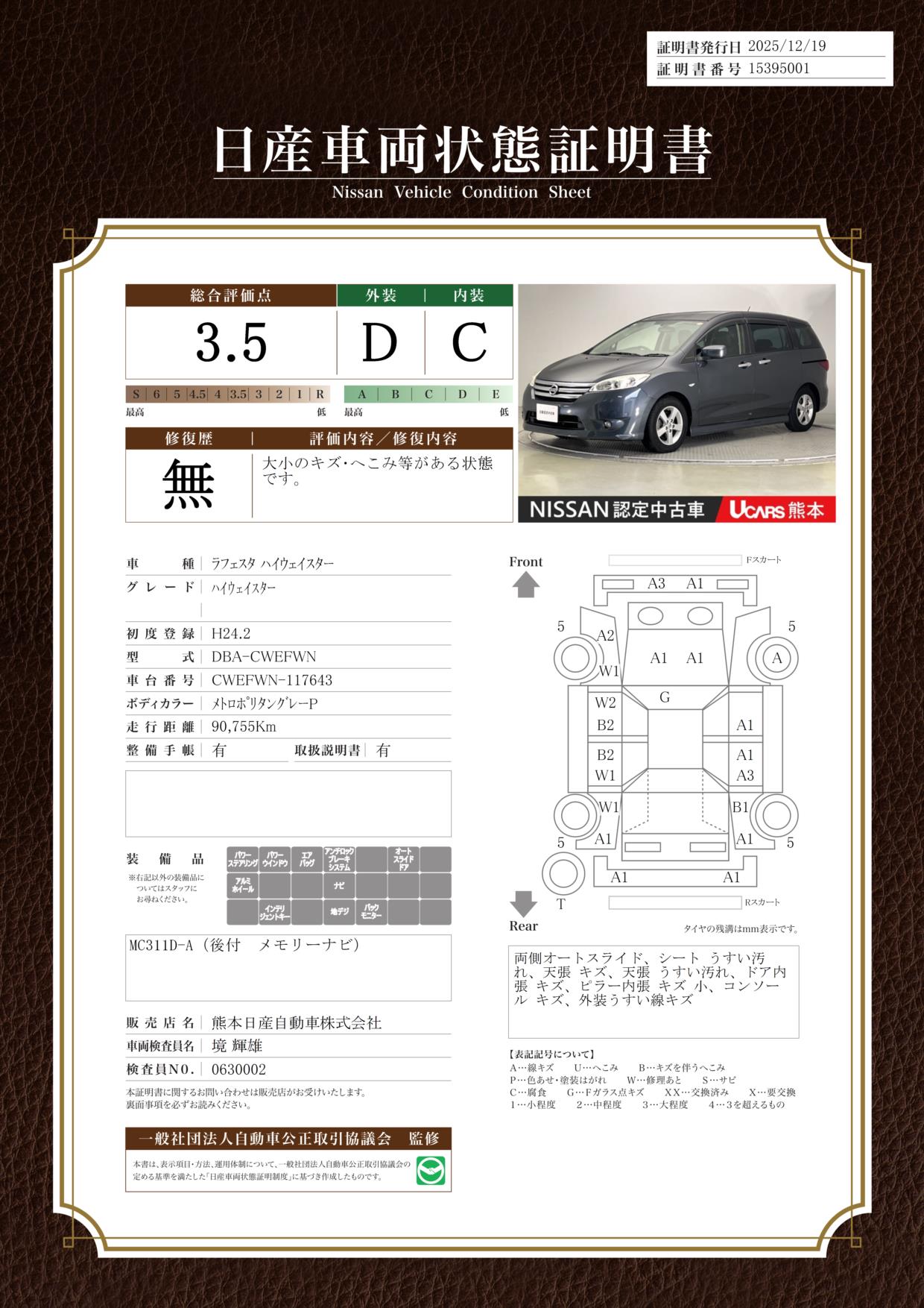 評価機関 : 日産車両状態証明
