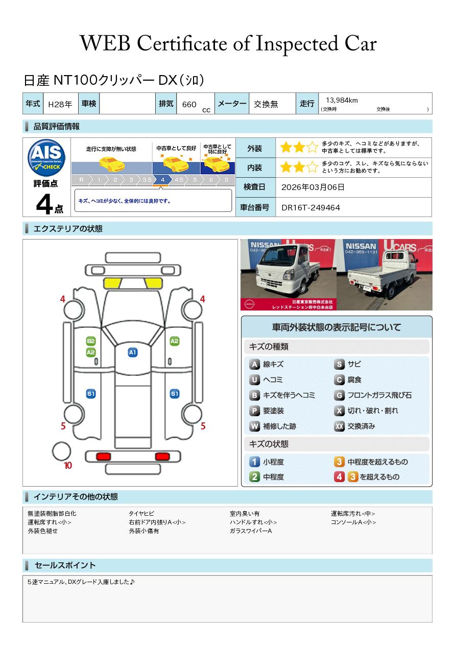 現状括弧書き内の年月まで車検有効期限が残っていますが、ご成約時に新しく車検を取り直します。なお取り直しの費用は車両価格に含まれています。