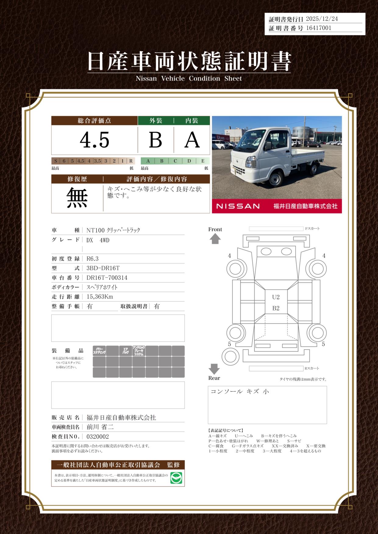評価機関 : 日産車両状態証明
