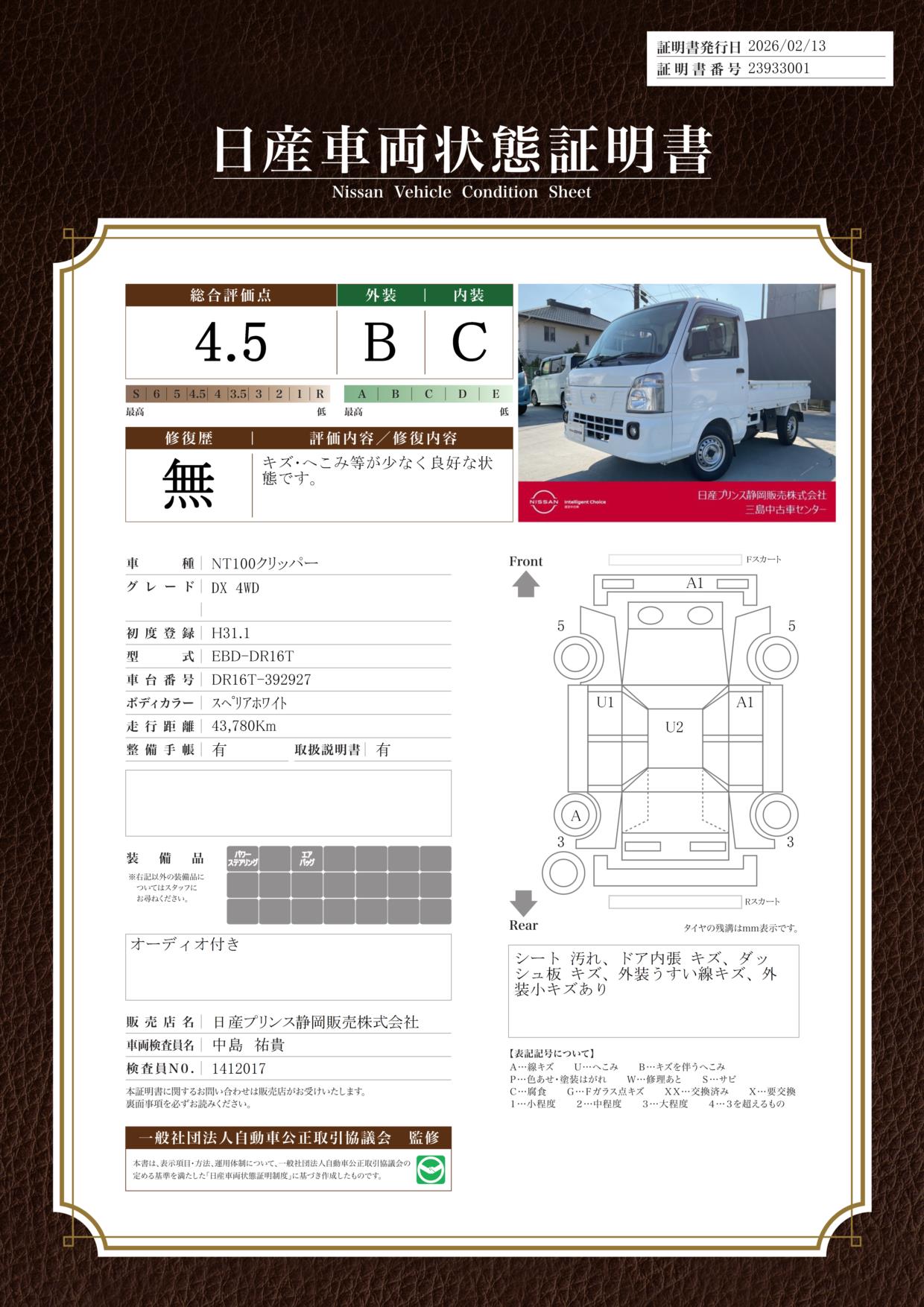 現状括弧書き内の年月まで車検有効期限が残っていますが、ご成約時に新しく車検を取り直します。なお取り直しの費用は車両価格に含まれています。