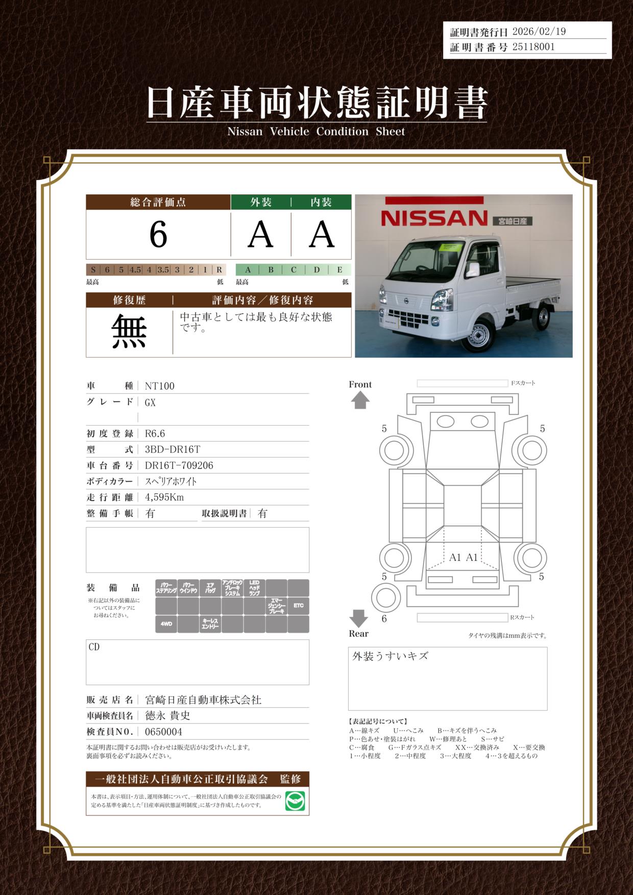 「車両状態証明書」は、査定協会監修のプロの検査員が公正かつ確かな基準で検査した”安心の証”です。