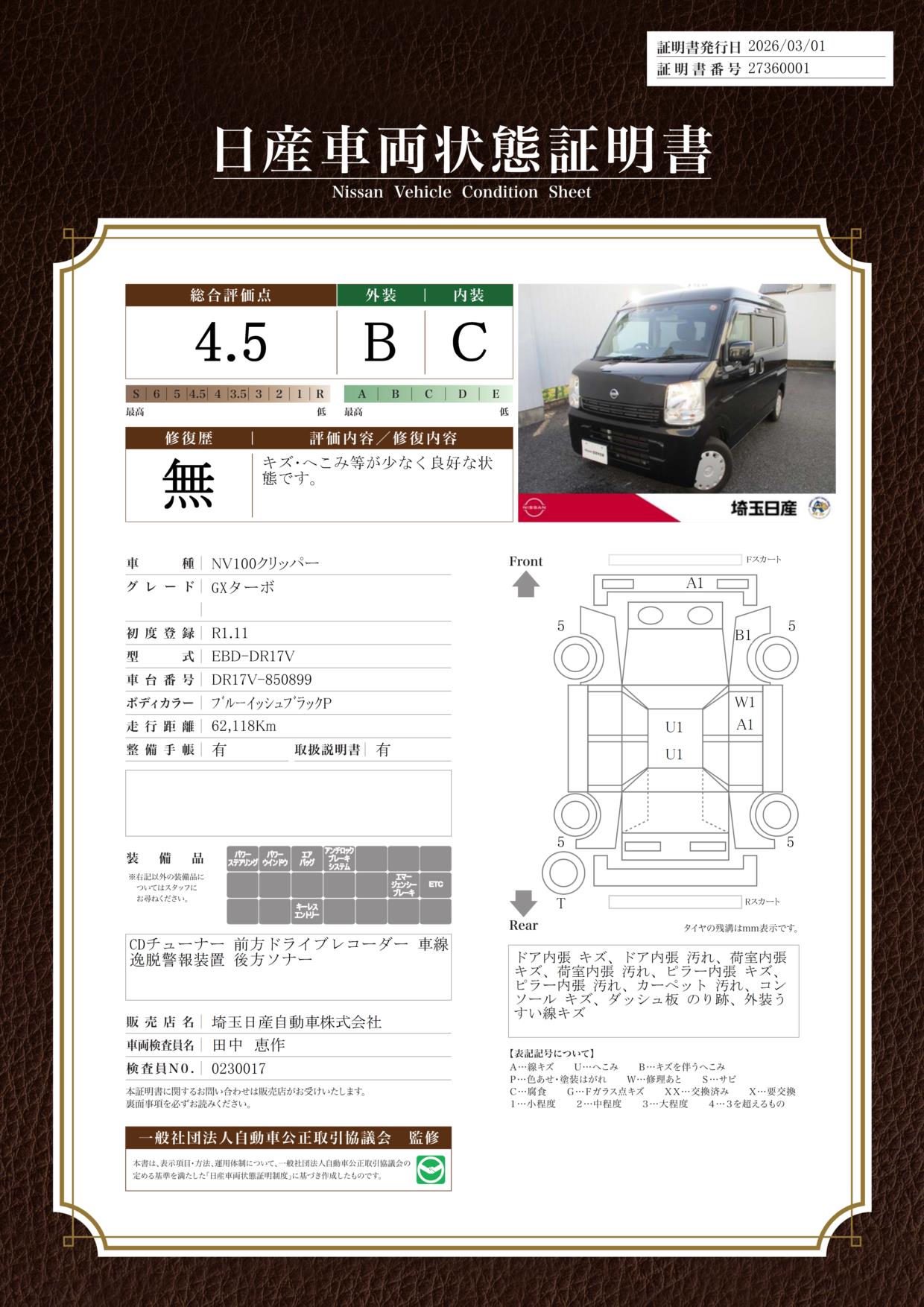 現状括弧書き内の年月まで車検有効期限が残っていますが、ご成約時に新しく車検を取り直します。なお取り直しの費用は車両価格に含まれています。
