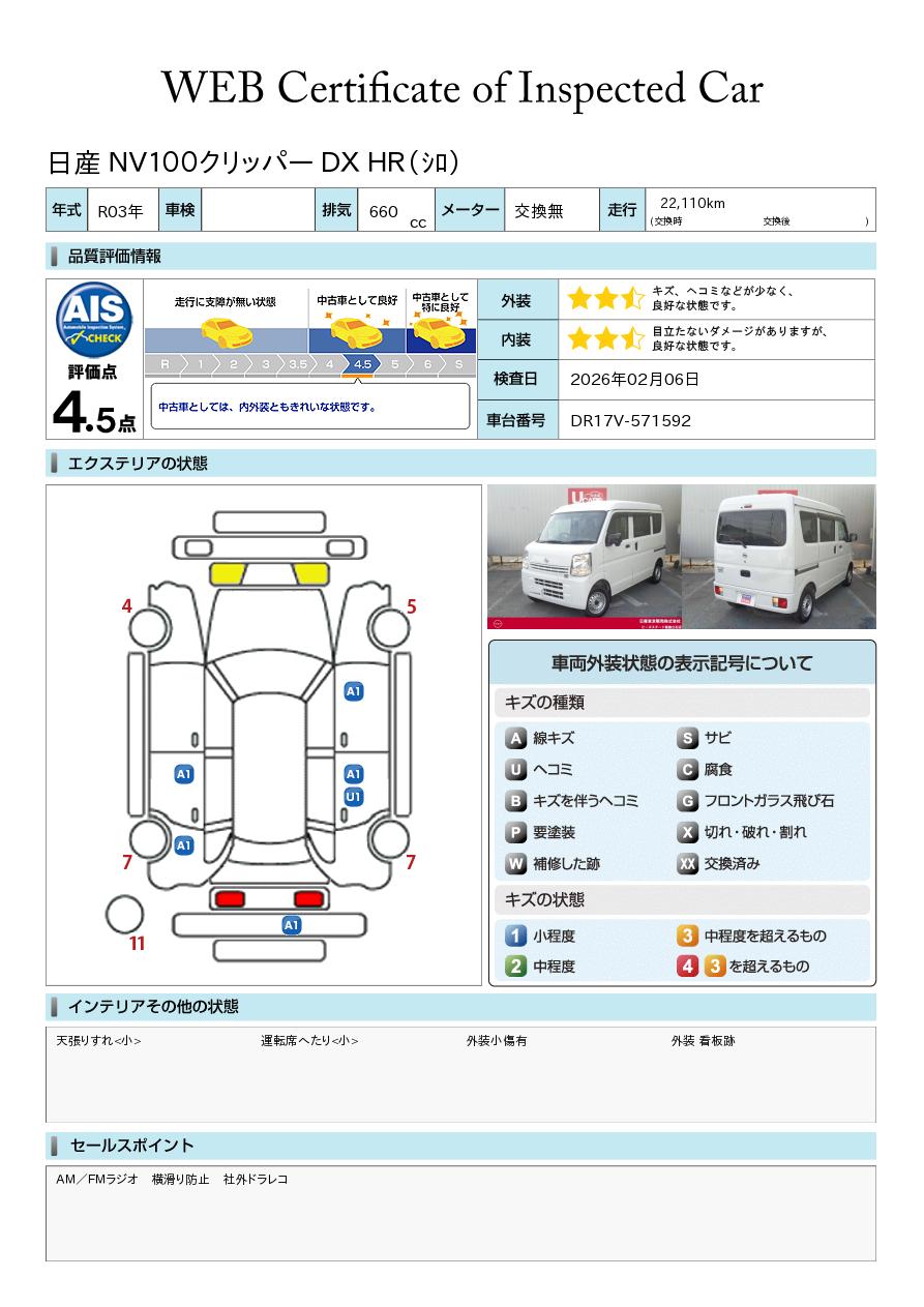 現状括弧書き内の年月まで車検有効期限が残っていますが、ご成約時に新しく車検を取り直します。なお取り直しの費用は車両価格に含まれています。