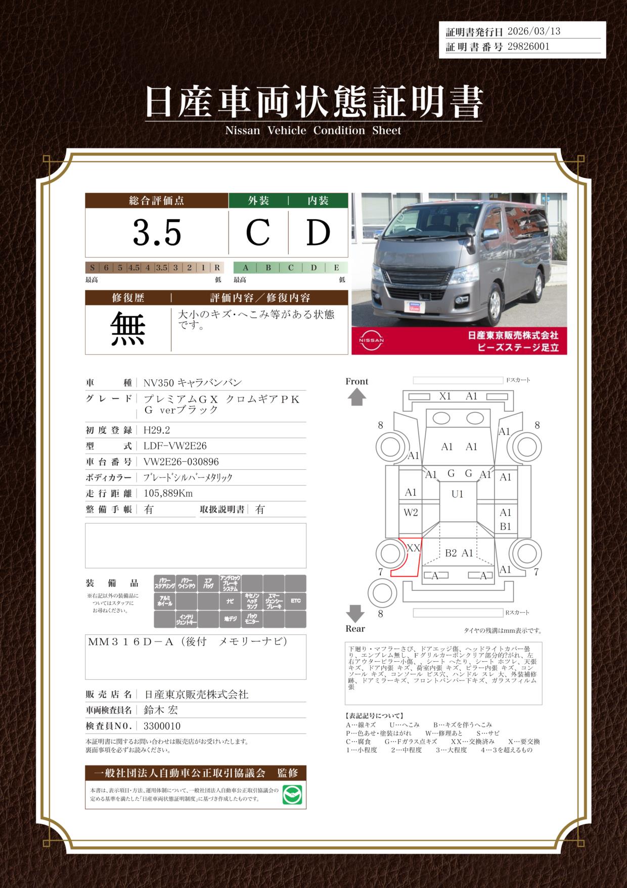 現状括弧書き内の年月まで車検有効期限が残っていますが、ご成約時に新しく車検を取り直します。なお取り直しの費用は車両価格に含まれています。