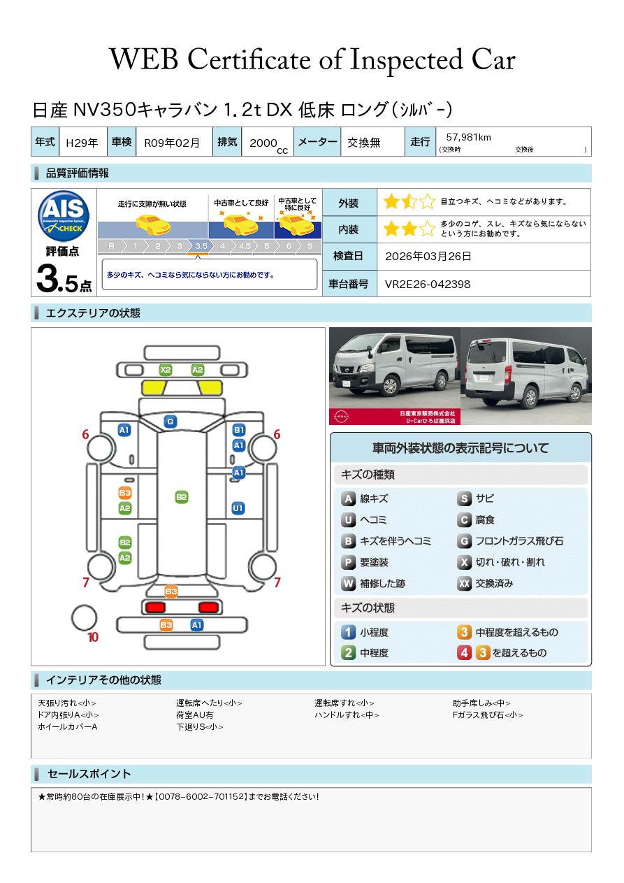 NV350キャラバン2.0 DX ロングボディ エマージェンシーブレーキ