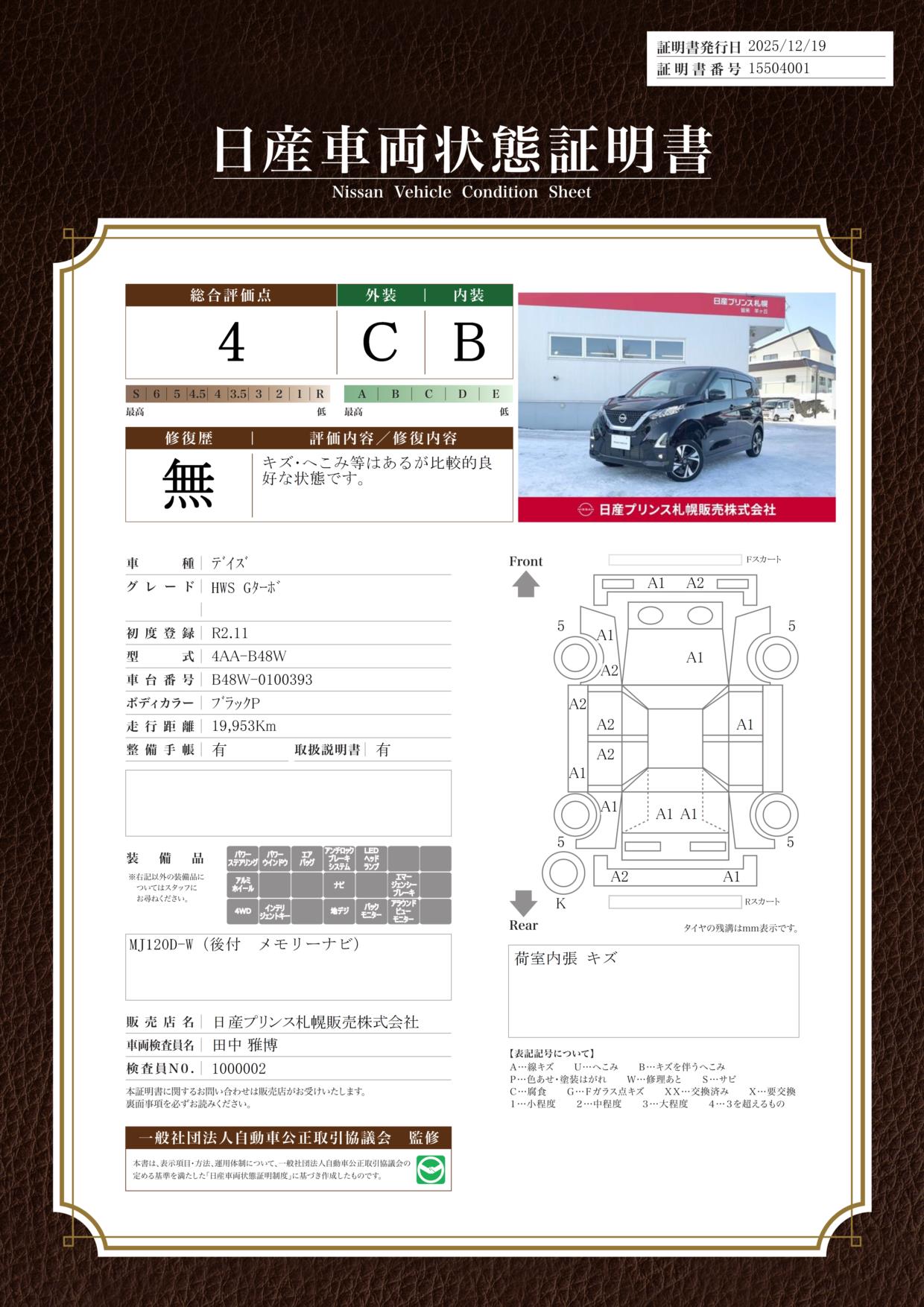 現状括弧書き内の年月まで車検有効期限が残っていますが、ご成約時に新しく車検を取り直します。なお取り直しの費用は車両価格に含まれています。