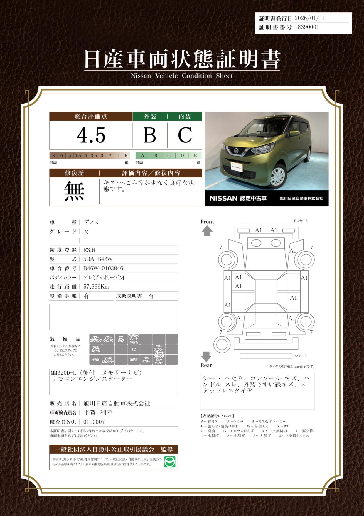 現状括弧書き内の年月まで車検有効期限が残っていますが、ご成約時に新しく車検を取り直します。なお取り直しの費用は車両価格に含まれています。