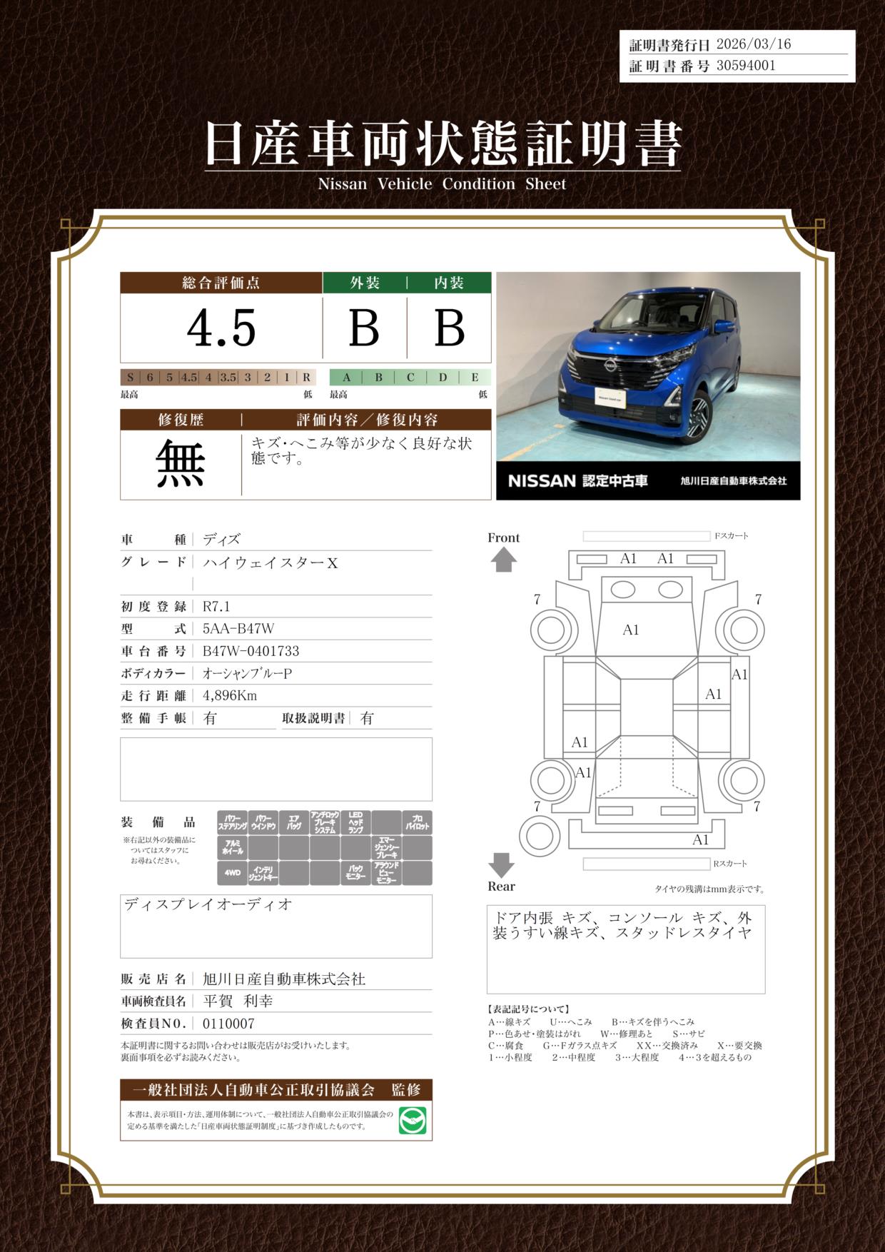 「車両状態証明書」は、査定協会監修のプロの検査員が公正かつ確かな基準で検査した”安心の証”です。