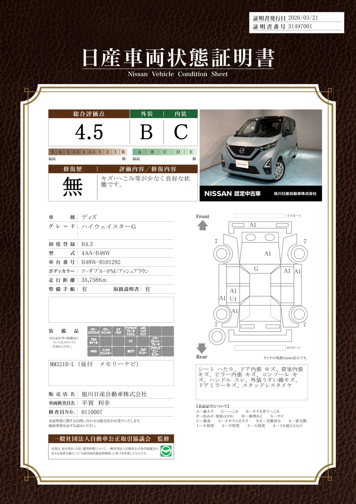 日産車両状態証明