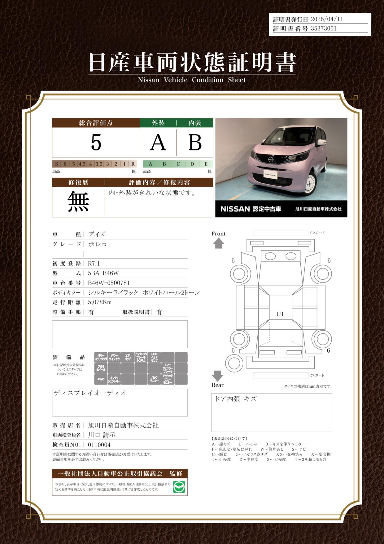 「車両状態証明書」は、査定協会監修のプロの検査員が公正かつ確かな基準で検査した”安心の証”です。