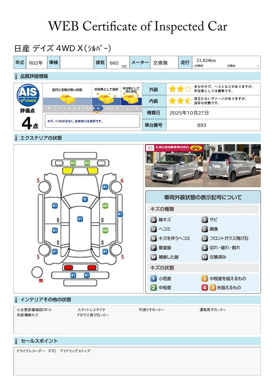 令和2年 デイズ X シルバー 4WD 入荷いたしましたドライブレコーダー  アイドリングストップ