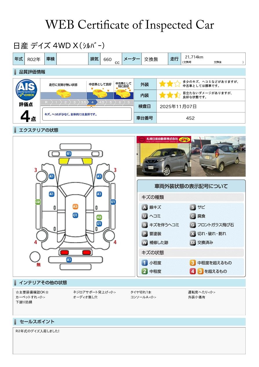 日産車は勿論のこと他メーカーでもコンパクト車からワゴン車まで幅広く展示中! 「くるまるく」店の中でもスケールの大きい店舗ですので、在庫数も豊富に常時90台~100台展示中! AIS評価書付車両(第三者評価書)も多数ございますので、ご安心ください♪ 安心の日産「ワイド保証」や「自社ピット」完備! スタッフ一同お待ち申し上げております^^ 全車走行メーター管理システム導入☆(日本オートオークション協議会)