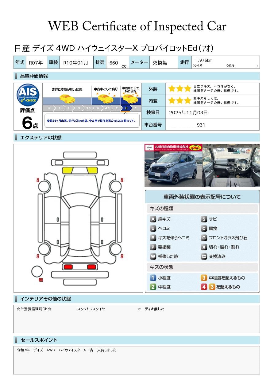 令和7年 デイズ 4WD ハイウェイスターX 青 入荷しましたSOSコールスイッチ プロパイロット 横滑り防止装置 夏タイヤ積込み