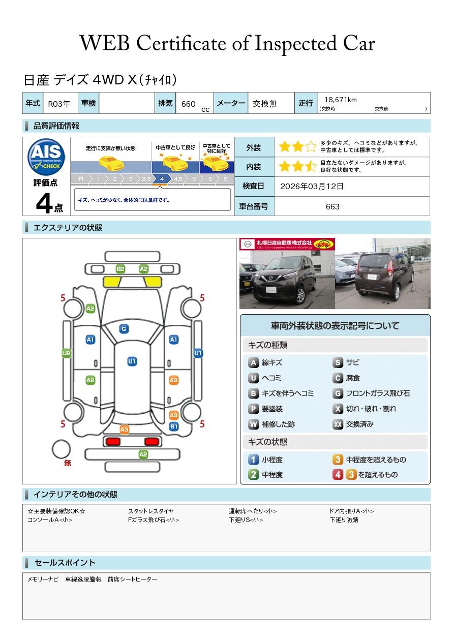 現状括弧書き内の年月まで車検有効期限が残っていますが、ご成約時に新しく車検を取り直します。なお取り直しの費用は車両価格に含まれています。