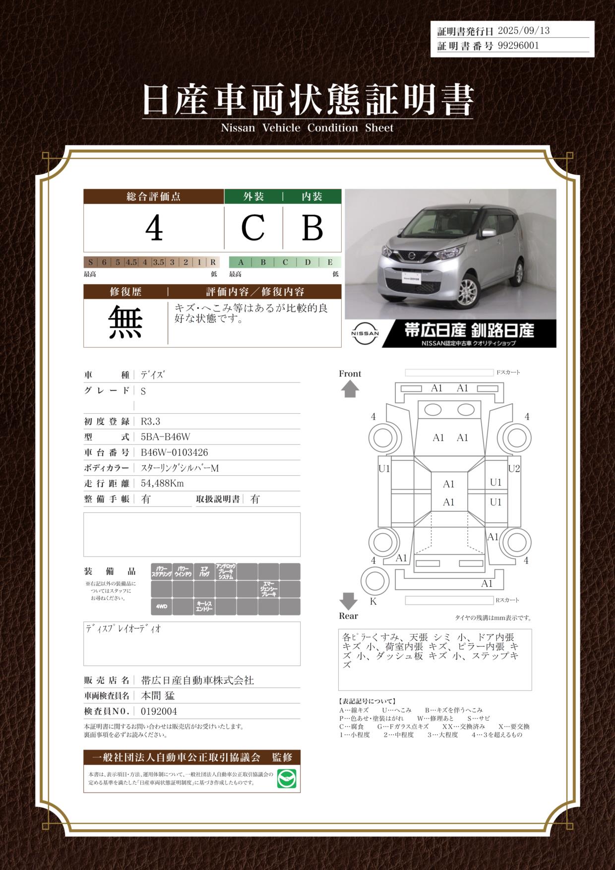 ディスプレイオーディオワンオーナー定期点検記録簿障害物センサー運転席助手席サイドカーテンAB