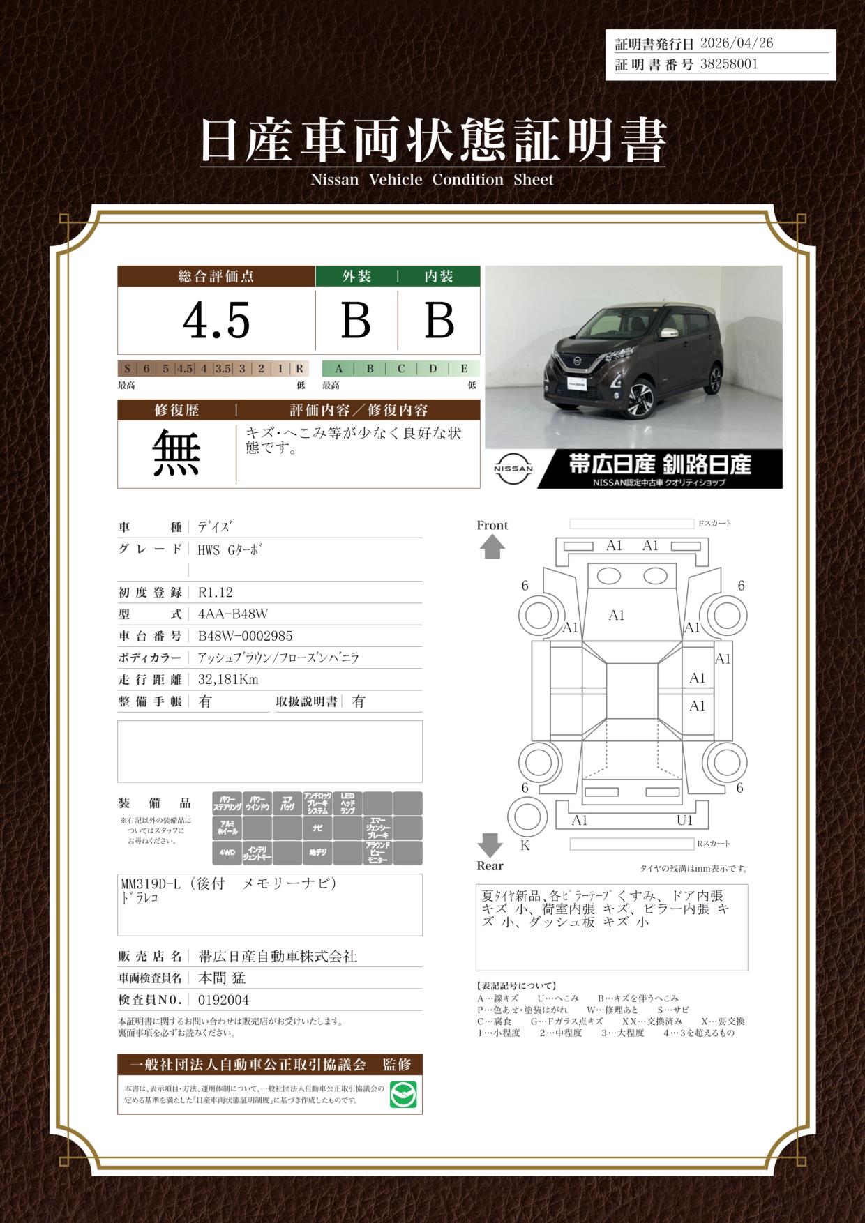 日産認定中古車│ターボグレードの力強い走りが体感できる2トーンカラーのデイズが入庫しました!障害物S衝突被害軽減ブレーキ横滑り防止装置A踏み間違い防止装置定期点検記録簿