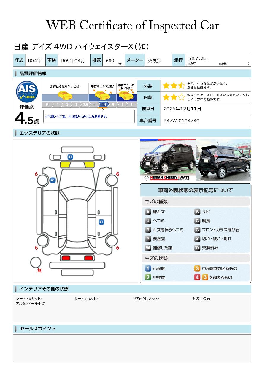 デイズ 660cc 660 ハイウェイスターX 4WD バックカメラ スマートキーx2 純正エンジ
