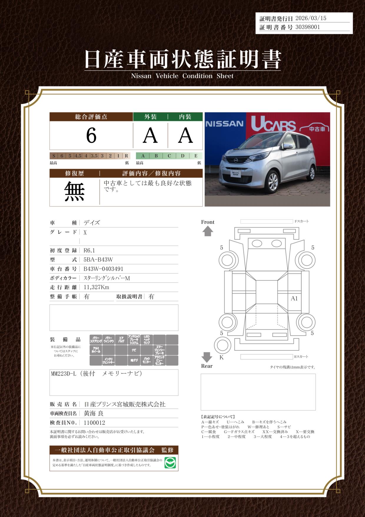 「車両状態証明書」は、査定協会監修のプロの検査員が公正かつ確かな基準で検査した”安心の証”です。