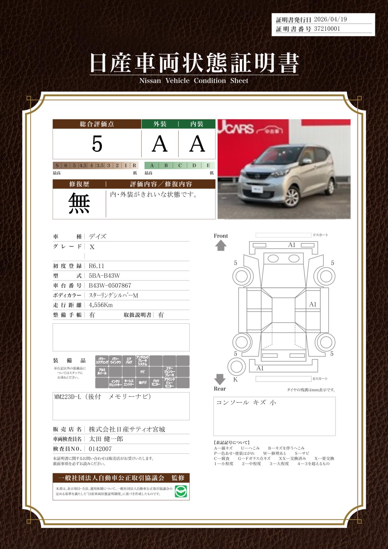 「車両状態証明書」は、査定協会監修のプロの検査員が公正かつ確かな基準で検査した”安心の証”です。