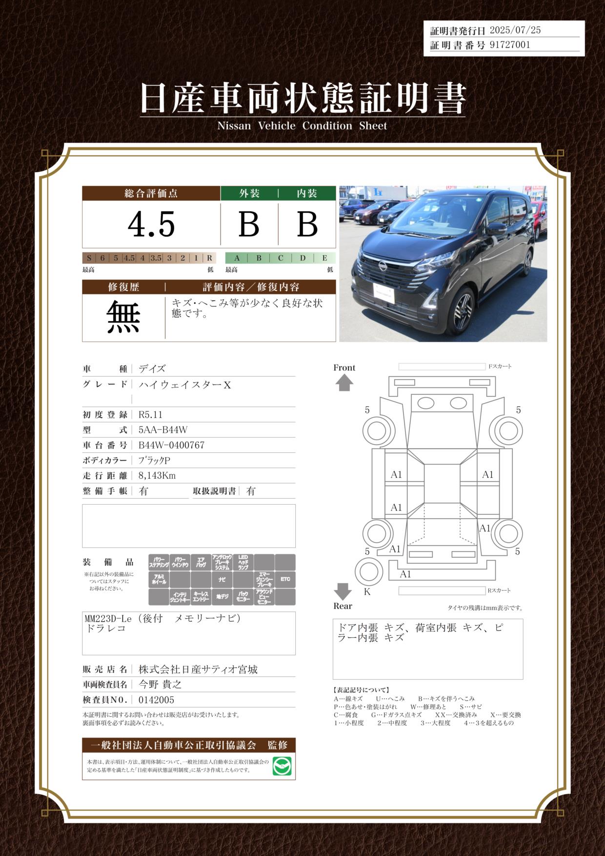 現状括弧書き内の年月まで車検有効期限が残っていますが、ご成約時に新しく車検を取り直します。なお取り直しの費用は車両価格に含まれています。