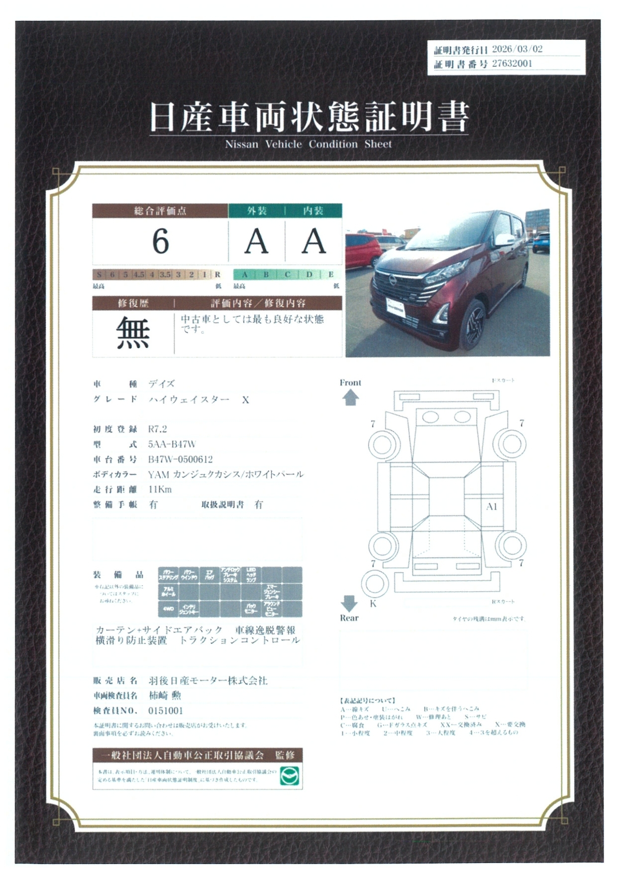 「車両状態証明書」は、査定協会監修のプロの検査員が公正かつ確かな基準で検査した”安心の証”です。